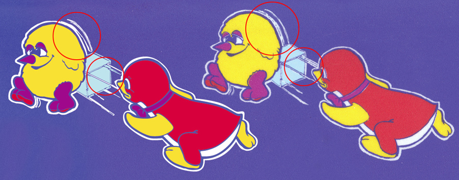 1. The Upper Right Pengo and Sno-Bee are a mirror of the left side. The artwork is a touch different as well, take a look at the circled portions (Click photo for larger Pengo detail image). Mostly differences in the motion lines by the Sno-Bee. If I do a retrace, it won’t be just on the partial sections, but over the whole piece. I will have to take votes on what people think and whether I should trace the right side as well.