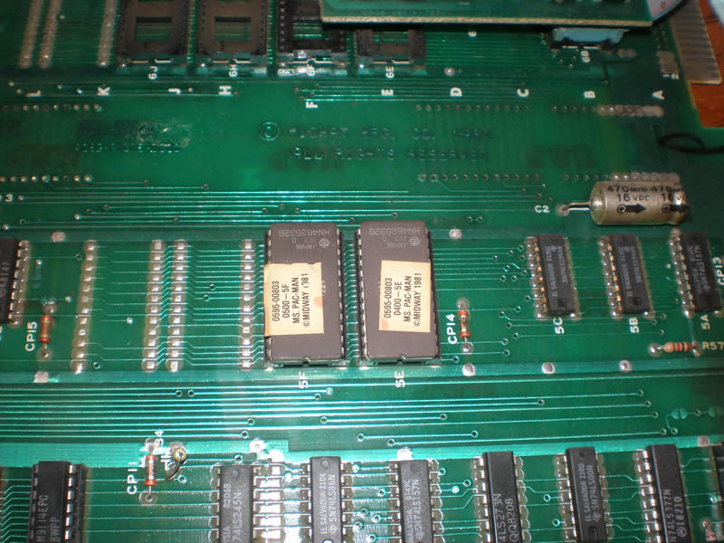 Here is a photo of the two ROMs in question on the Ms. Pac-man board, with a little 5E and 5F printed on the PCB just below them.
