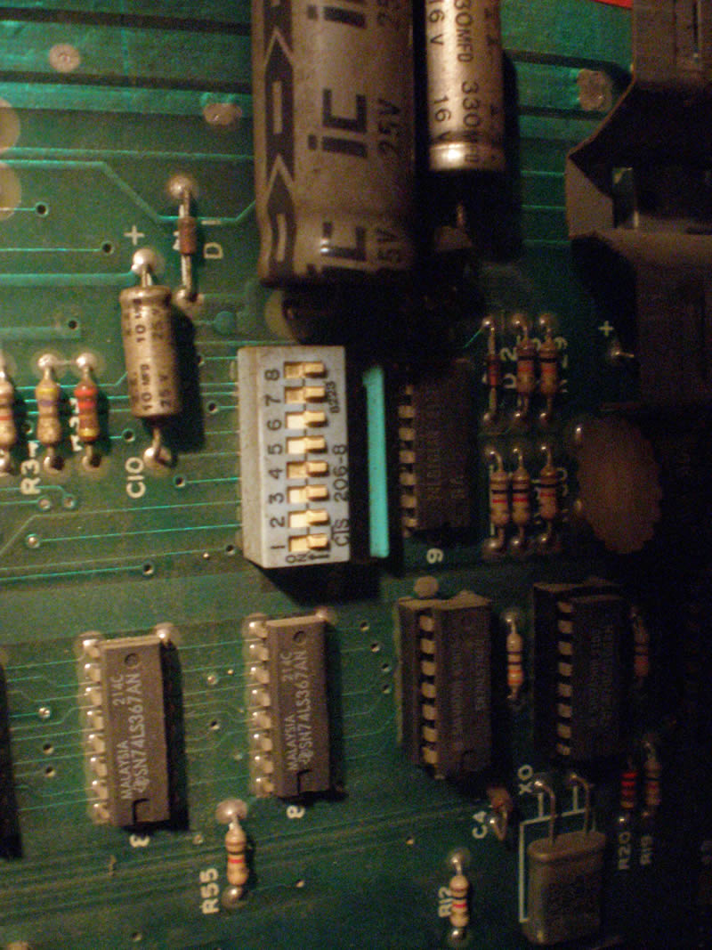 Don’t power up your machine just yet, we’ll do that soon enough. In order to set your DIP switches take off the back door of your machine and let’s get access to the PCB. We are looking for the block of DIP switches to initially setup your Multi Pac configurations. Those DIP switches look something like this (This photo I took was after I had configured my Multi Pac kit. So you see all of the dip switches are “off”. Make sure to flip #6 the other direction to “on”, otherwise you wont’ see your config screen.);
