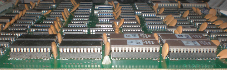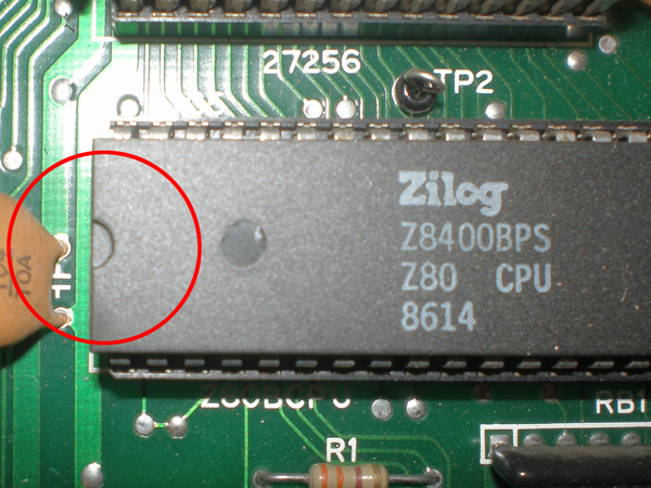 Step 4. Review your work to be sure that the Z-80 chip has its notch in the right orientation (it should match the other 3 small chips near the top of the Multi board). Check the sub-board at 5E to ensure its notch is oriented the same as the other chips on the main PCB. Check for any bent pins.