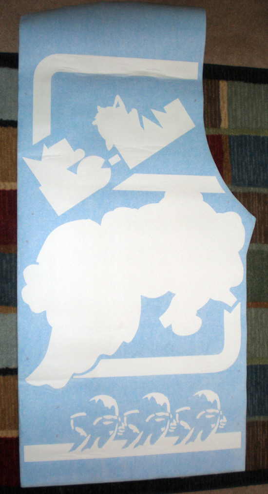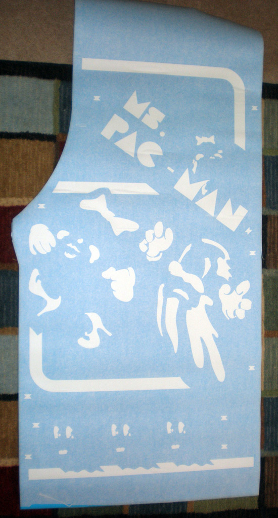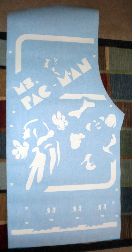 If memory serves me, when Paul did his cabinet, he actually cut out into separate pieces the artwork that wasn’t attached, like the Ms. Pac-man on the lettering was a separate piece of vinyl from the ghost chasing Ms. Pac-man and down. This would save some cost in adhesive vinyl, but it introduced a new level of difficulty to the stencils because you would have to double check your work to make sure placement of the two pieces was correct.