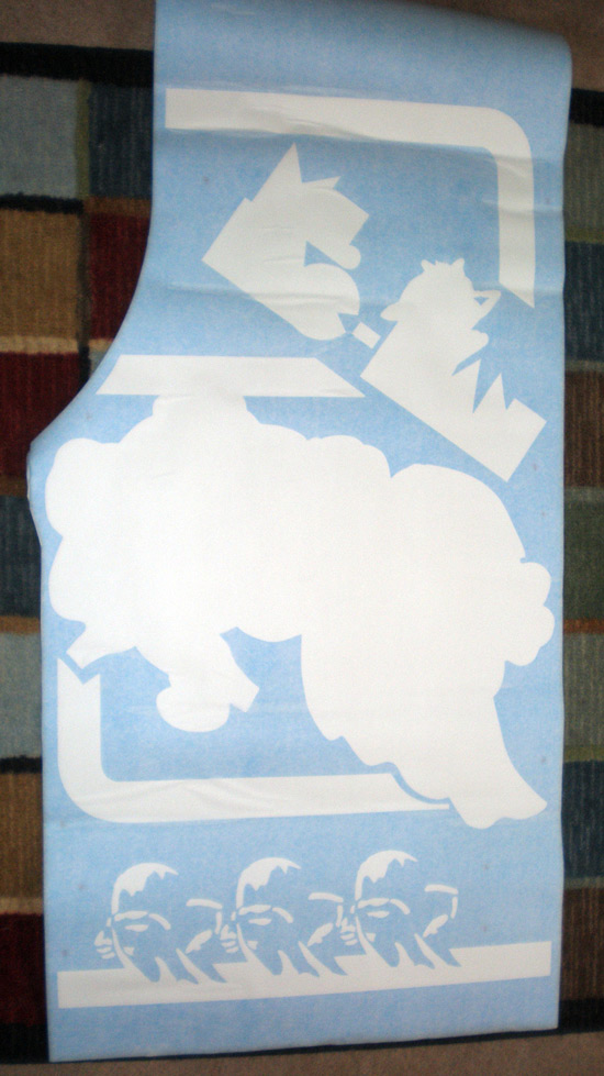 By having the stencils in one piece there is no question where each element of the sideart should be placed, just use the registration shapes (the squashed hourglass in this case) and away we go. But, this method does mean that the vinyl will have to stretch the whole height of the cabinet, and at three colors per side that means 9 separate stencil pieces need to be made.
